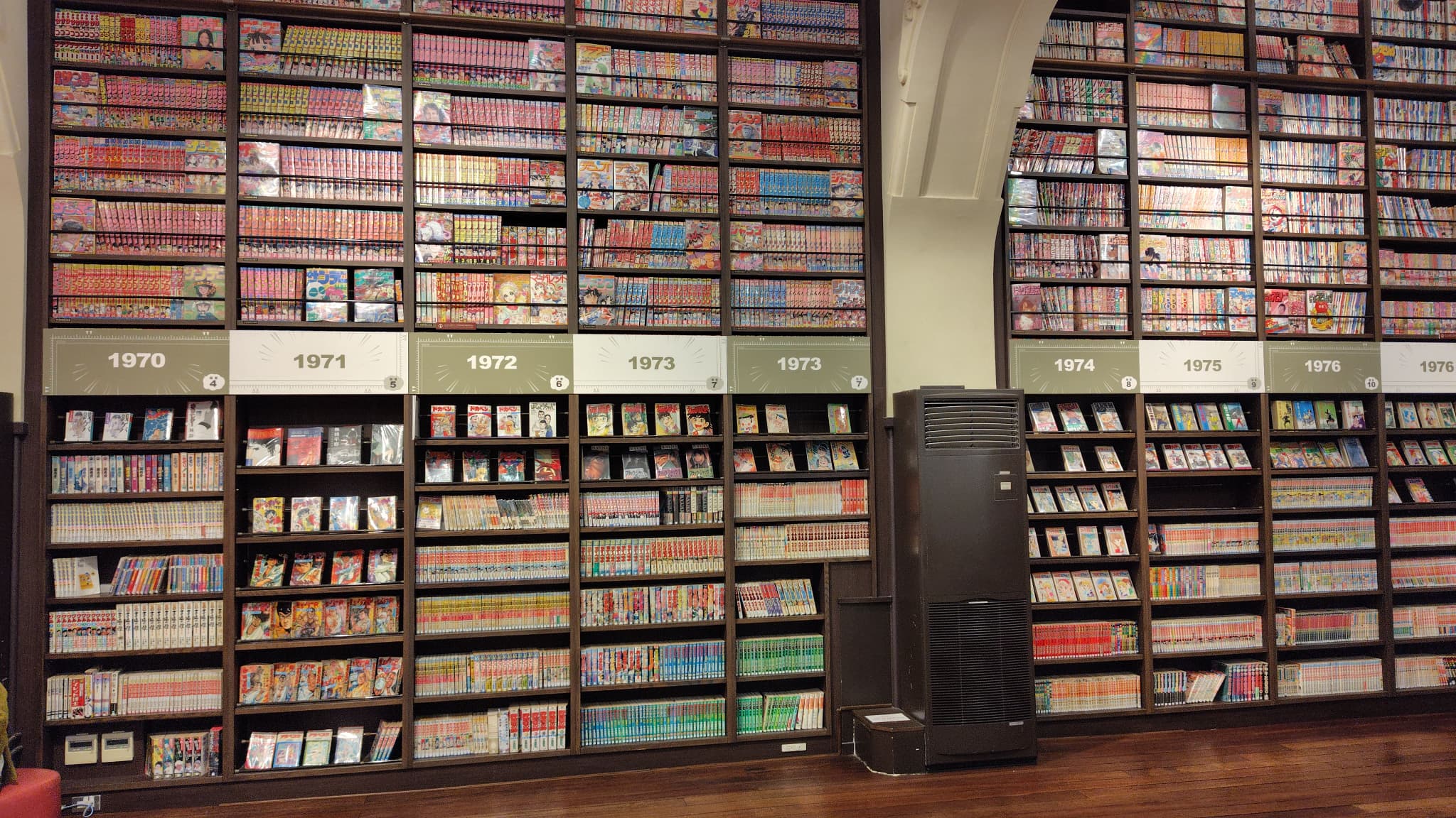 The books are organized by publisher and publication year, allowing visitors to see how manga has evolved over time. The shelves include popular titles from the late 20th century as well as many lesser-known works that are difficult to find elsewhere.